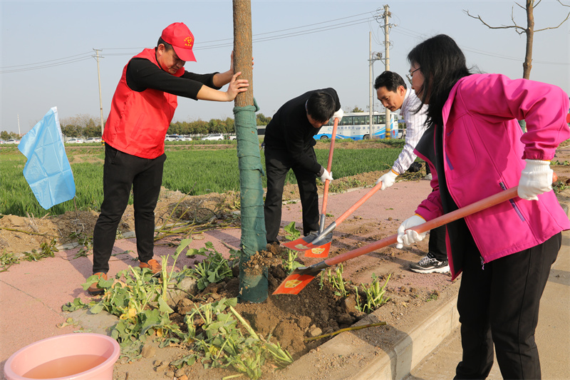 在經濟開發(fā)區(qū)宋玉七路,干部群眾紛紛拿起鐵鍬加入到植樹隊伍行列,揮鍬鏟土、栽植新綠。她們扶樹填土、踩實修整、提桶澆水……每道工序緊密銜接、配合默契,現(xiàn)場一派熱火朝天場面。經過一番緊張有序的勞動,一株株新栽種的香樟樹錯落有致、迎風挺立。