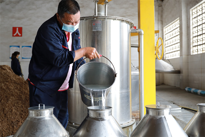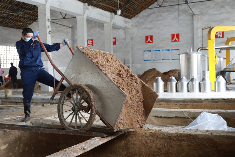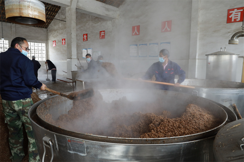 4月24日,記者在湖北楚貢酒業(yè)有限公司釀酒車間生產(chǎn)車間看到,現(xiàn)場(chǎng)蒸汽升騰,伴隨著陣陣酒香,工人們干勁十足忙著拌糟、上甑、攤涼、入池發(fā)酵……認(rèn)真做好釀酒的每一個(gè)環(huán)節(jié)。一邊是入池忙發(fā)酵,另一邊是對(duì)已經(jīng)發(fā)酵好的原料上甑出酒。