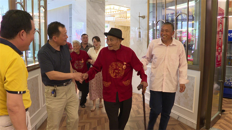 "感謝大家百忙之中來(lái)參加我的生日宴,見到大家我很開心,也祝愿大家身體健康,平安吉祥,萬(wàn)事如意。"百歲老人嚴(yán)忠信還興致勃勃上臺(tái)講話。