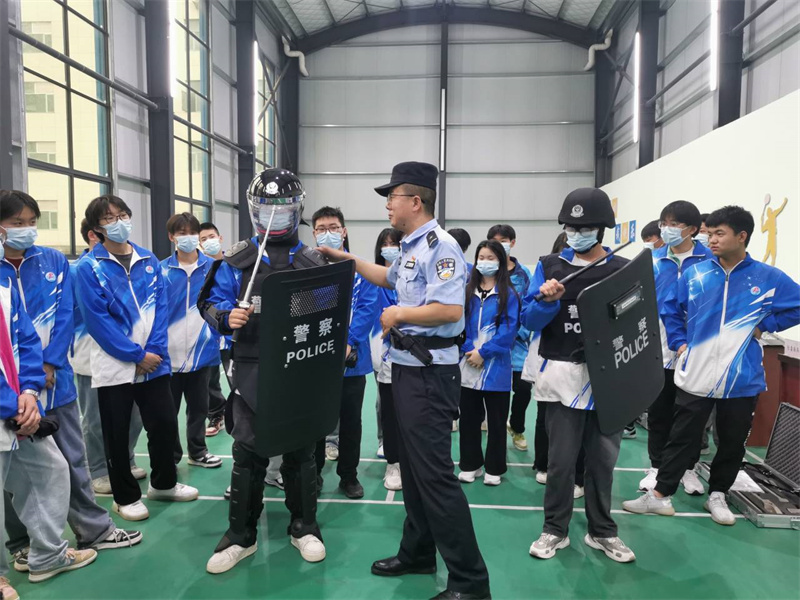 活動中,警官帶領同學們參觀了公安局110指揮中心,向大家介紹了公安視頻監(jiān)控系統(tǒng)的建設、特點和作用等,讓學生們深刻感受到了公安科技的強大。隨后警官帶領學生們來到警械展示區(qū),向大家一一介紹一系列警用裝備,邊介紹邊向學生們演示了伸縮警棒、強光手電、手銬、腳銬等警具的使用,并讓同學試戴了警用頭盔、穿戴了防刺服、體驗了警用鋼叉等。學生們聽得興致勃勃,在互動環(huán)節(jié)更是積極踴躍,忍不住上前摸一摸、試一試,真真實實地過了一把“警察癮”。