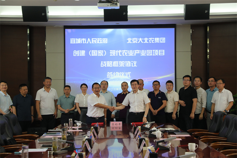 大北農(nóng)集團常務(wù)副總裁王金文與宜城市委常委、副市長朱曉林簽訂《宜城市人民政府與北京大北農(nóng)科技集團股份有限公司關(guān)于創(chuàng)建國家現(xiàn)代農(nóng)業(yè)產(chǎn)業(yè)園項目戰(zhàn)略框架協(xié)議》。