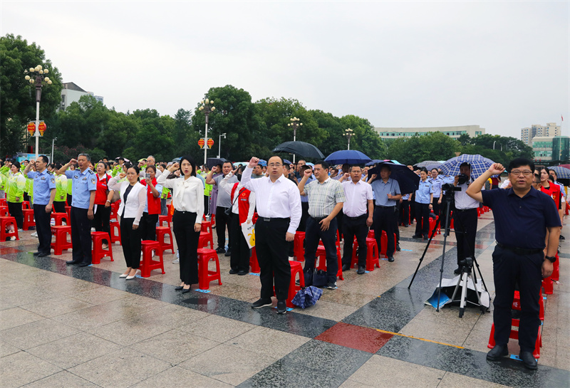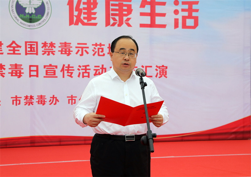 市委書記武義泉致辭。他指出,近年來,宜城市禁毒工作成效顯著,特別是去年啟動創(chuàng)建"全國禁毒示范城市"工作以來,全市上下多方聯(lián)動,凝聚合力,毒品預防宣傳教育體系和治理體系不斷完善,毒品蔓延勢頭得到有效控制,吸毒人員戒毒幫扶工作取得了較大的突破,由毒品引發(fā)的刑事治安案件明顯減少,全社會自覺抵制毒品的氛圍日漸濃厚。