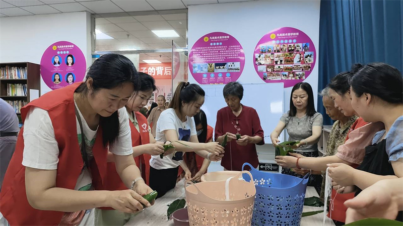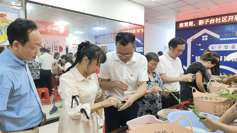 "拿兩片葉子這樣折一下,手要稍微彎一下,米不要太多了,不然容易漏……"在郾子臺社區(qū)群眾服務(wù)中心大廳,教育局和社區(qū)的黨員志愿者們與居民歡聚一堂,一邊包粽子,一邊嘮家常,還時不時討論一下端午節(jié)各地的習(xí)俗、粽子的來歷、粽子的包法等等,現(xiàn)場歡聲笑語,其樂融融。