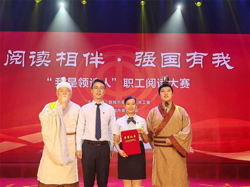 “閱讀提升品味,求知豐富人生,我的朗誦作品能在宜城市級展演中獲三等獎,好開心,我會繼續(xù)努力,在書香沁潤中成就更好的自己!蹦蠣I所收費員許曉月笑著說。