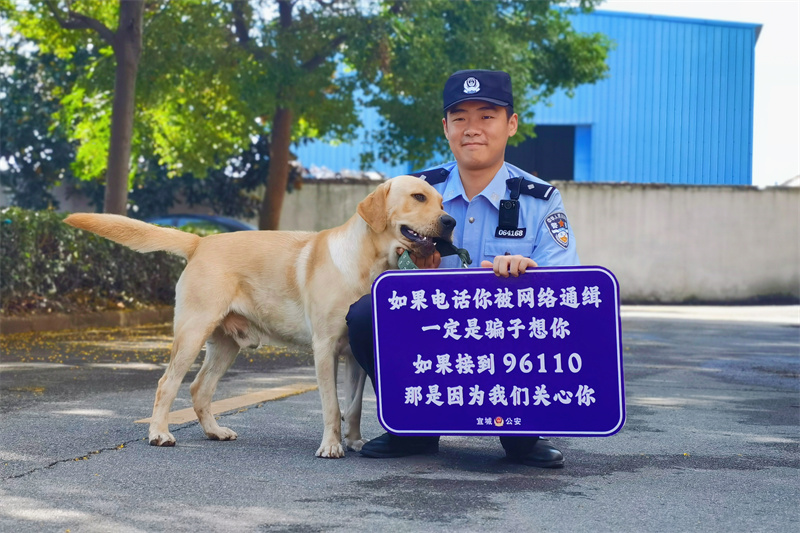 “如果有人電話告訴你被網(wǎng)絡(luò)通緝,一定是騙子想你;如果接到96110,那是因為我們關(guān)心你!苯o它脖子戴上反詐宣傳牌,由民警牽繩進行巡邏,小狗反詐宣傳員吸引了許多群眾駐足觀看。