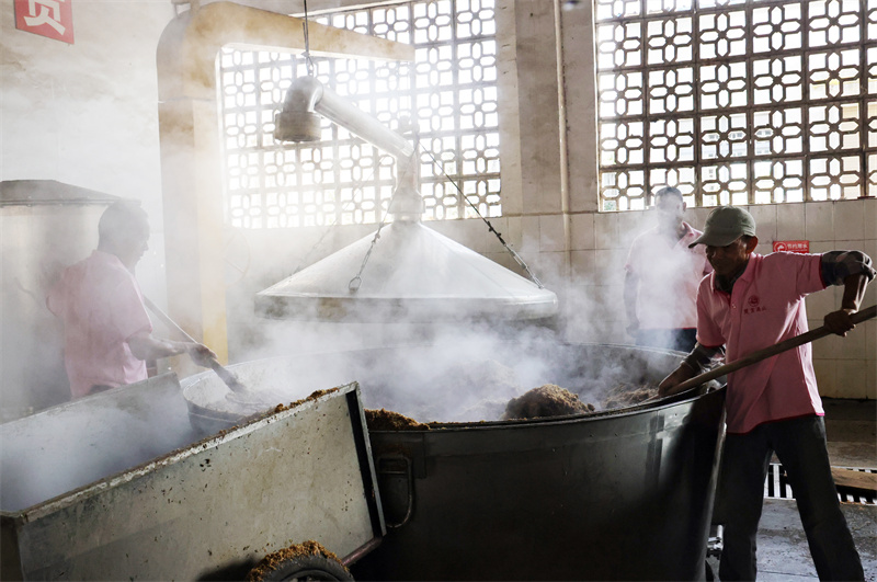 10月18日,記者在湖北楚貢酒業(yè)有限公司釀造車(chē)間看到,現(xiàn)場(chǎng)蒸汽升騰,伴隨著陣陣酒香,工人們遵循傳統(tǒng)手工釀造技藝,從甑子里將蒸好的酒糟轉(zhuǎn)運(yùn)出來(lái),翻曲拌糟冷卻,然后拖運(yùn)窖池群發(fā)酵,等待上甑蒸酒。各個(gè)環(huán)節(jié)有條不紊,工人們干勁十足認(rèn)真做好釀酒的每一個(gè)環(huán)節(jié)。