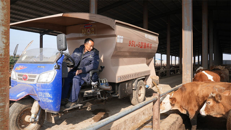 11月16日,位于鄭集鎮(zhèn)雙龍村的龍杰牧業(yè)有限公司肉牛養(yǎng)殖場(chǎng),一排排牛舍寬敞整齊,飼養(yǎng)員正駕駛著撒料車將飼料倒入食槽,一頭頭健碩的西門塔爾、夏洛來(lái)肉牛悠閑地吃著搭配好的草料。