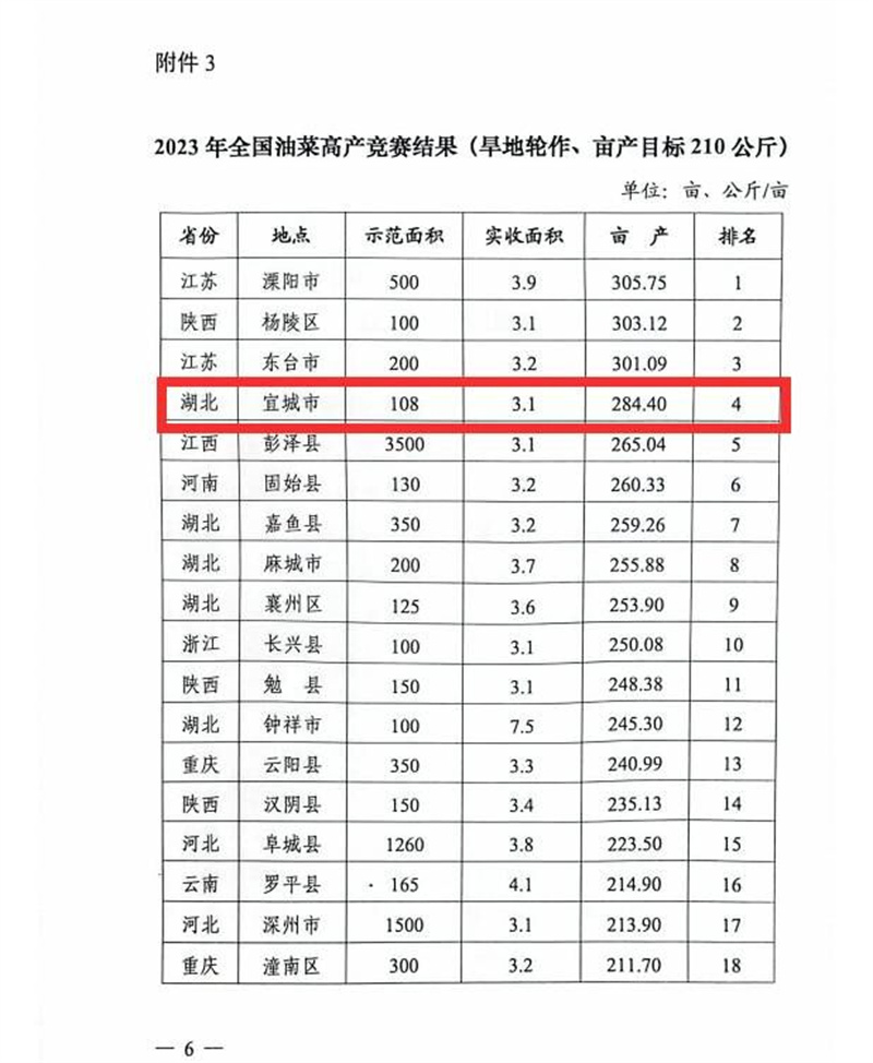本網(wǎng)訊記者劉毅報(bào)道:近日,全國(guó)農(nóng)業(yè)技術(shù)推廣服務(wù)中心公布了2023年全國(guó)油菜高產(chǎn)競(jìng)賽結(jié)果。全國(guó)共有56個(gè)示范點(diǎn)達(dá)到高產(chǎn)競(jìng)賽目標(biāo),其中,稻油輪作區(qū)25個(gè)、旱地輪作區(qū)18個(gè)、稻稻油輪作區(qū)6個(gè)、春油菜區(qū)7個(gè)。宜城市取得旱地輪作示范點(diǎn)全省第一、全國(guó)第四的好成績(jī)。