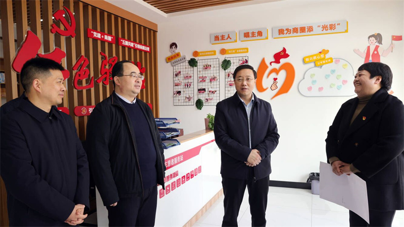 在襄陽(yáng)市基層黨建重點(diǎn)項(xiàng)目揭榜掛帥試點(diǎn)單位宜城市光彩大市場(chǎng)商圈紅色驛站,趙芝斌詳細(xì)了解功能布局和作用發(fā)揮情況,聽取試點(diǎn)建設(shè)情況匯報(bào),對(duì)宜城市按照“黨建引領(lǐng)、條塊整合、精細(xì)服務(wù)、共同締造”的工作思路,推行“五圈共建”,凝聚共治共享合力,推動(dòng)黨建優(yōu)勢(shì)不斷轉(zhuǎn)化成為商圈發(fā)展勝勢(shì)的做法給予充分肯定。趙芝斌要求,要以“三鏈”為抓手,構(gòu)建商圈大黨建體系,增強(qiáng)黨組織的政治功能和組織功能,通過(guò)黨組織軸心公轉(zhuǎn)帶動(dòng)商社企群同軸共轉(zhuǎn)。要健全“組織鏈”,做強(qiáng)光彩商圈綜合黨委,完善“綜合黨委+黨支部+黨員中心戶+企業(yè)/商戶”的組織構(gòu)架,把黨的組織覆蓋和工作覆蓋延伸到每個(gè)商戶;要打造“先鋒鏈”,注重發(fā)揮黨員先鋒模范作用,建立黨員定崗定責(zé)制,開展“黨員示范戶”評(píng)比,引領(lǐng)商戶向優(yōu)秀看齊、向黨組織靠攏;要完善“共建鏈”,堅(jiān)持黨建帶群建和群建促社建,幫助商圈孵化組建社工類、行業(yè)協(xié)會(huì)等各類社會(huì)組織,發(fā)揮行業(yè)協(xié)會(huì)在規(guī)范經(jīng)營(yíng)行為,引導(dǎo)有序發(fā)展,防治惡性競(jìng)爭(zhēng),維護(hù)市場(chǎng)形象方面的作用,共同締造高品質(zhì)示范商圈,同時(shí)要慎終如始抓好安全生產(chǎn)各項(xiàng)工作。