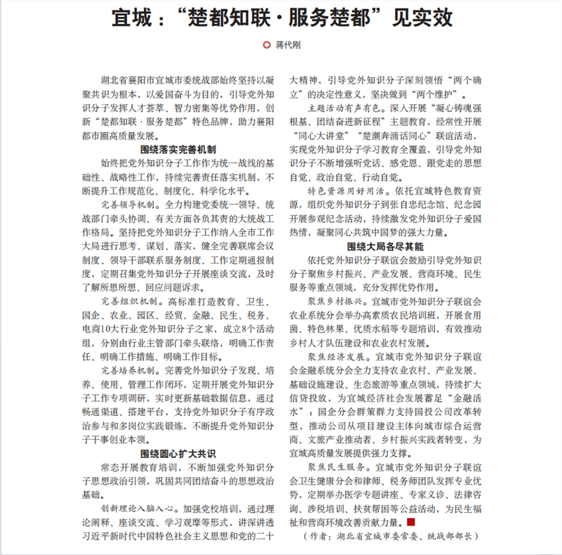 湖北省襄陽市宜城市委統(tǒng)戰(zhàn)部始終堅(jiān)持以凝聚共識(shí)為根本,以愛國(guó)奮斗為目的,引導(dǎo)黨外知識(shí)分子發(fā)揮人才薈萃、智力密集等優(yōu)勢(shì)作用,創(chuàng)新“楚都知聯(lián)·服務(wù)楚都”特色品牌,助力襄陽都市圈高質(zhì)量發(fā)展。