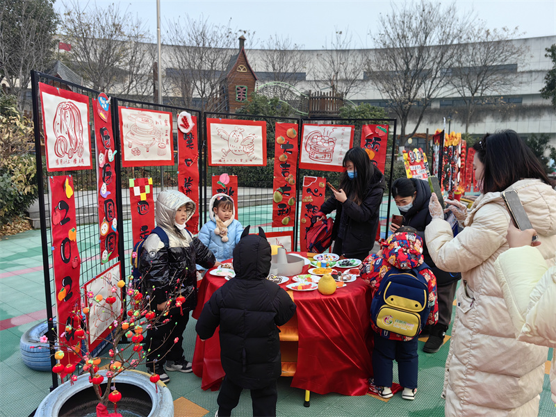 一走進(jìn)實(shí)驗(yàn)幼兒園,就看見紅紅的燈籠高高掛起,“五谷豐登”的擺臺(tái)上花生、瓜子、桂元、紅棗、玉米……象征收獲滿滿,栩栩如生的祥龍環(huán)繞各個(gè)大型玩具區(qū),熱氣騰騰的“火鍋”象征團(tuán)團(tuán)圓圓,一串串鞭炮、一幅幅對(duì)聯(lián)、一張張福字,讓的新年氣息撲面而來。