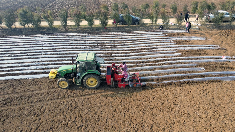 1月13日,在板橋店鎮(zhèn)王臺村一處示范基地,一臺農(nóng)業(yè)機械正在田間來回穿梭,搶抓晴好天氣播種馬鈴薯。