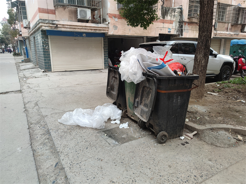 在中華園小區(qū)內(nèi),墻面上漆了許多小廣告,門面房前堆放了許多雜物;垃圾桶已滿未及時(shí)清理,一些垃圾隨意丟在路邊;在小區(qū)綠化帶上還堆放了許多雜物,給小區(qū)環(huán)境衛(wèi)生抹上了不和諧的色彩。