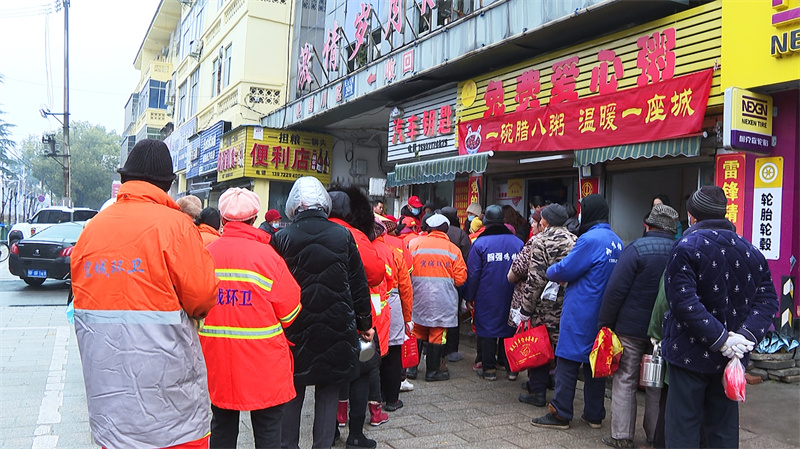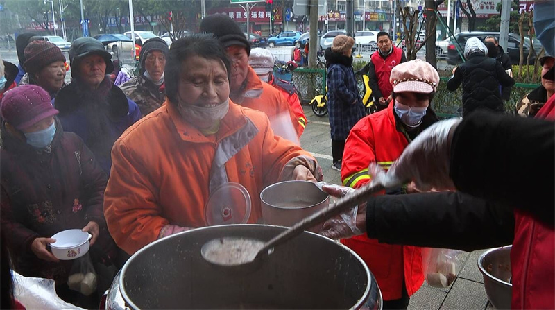 低保戶謝正明說(shuō):“感謝他們這么冷的天氣還為我們送臘八粥,我吃的心里暖和和的,為他們點(diǎn)贊!