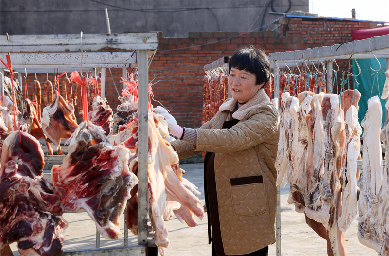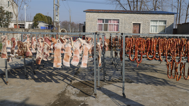 1月23日,記者走進(jìn)綠源豐農(nóng)民專業(yè)合作社院子,映入眼簾的是晾曬的一排排臘肉、臘蹄、臘香腸、醬魚、醬鵝翅……空氣中散發(fā)出撲鼻的臘香味,讓人垂涎欲滴。