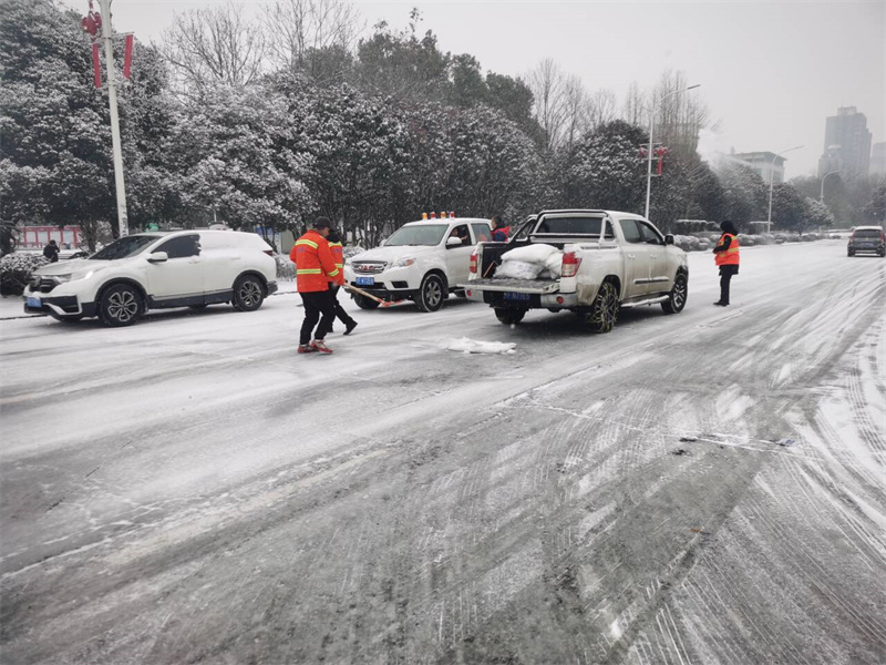 宜城市城管大隊(duì)黨支部委員劉華說(shuō):“城管部門以雪為令,組織系統(tǒng)干部職工800余人,上街撒鹽、鏟雪、除冰,確保市民出行暢通。”