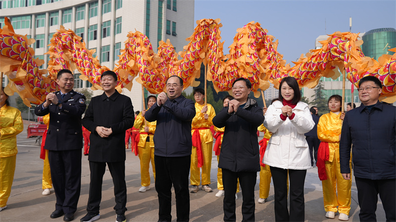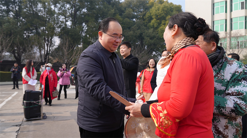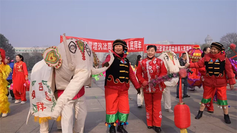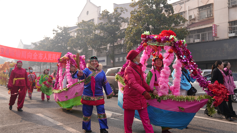 宜城市委書記武義泉,市人大常委會主任陳進(jìn)雷,市政協(xié)主席李源,市委常委、宣傳部部長蒙瑾,市委常委、市委辦主任曾勁松,副市長、公安局局長張雪峰與廣大市民一同觀看了演出,并向參演群眾和圍觀市民拜年,祝大家新年快樂,闔家幸福!