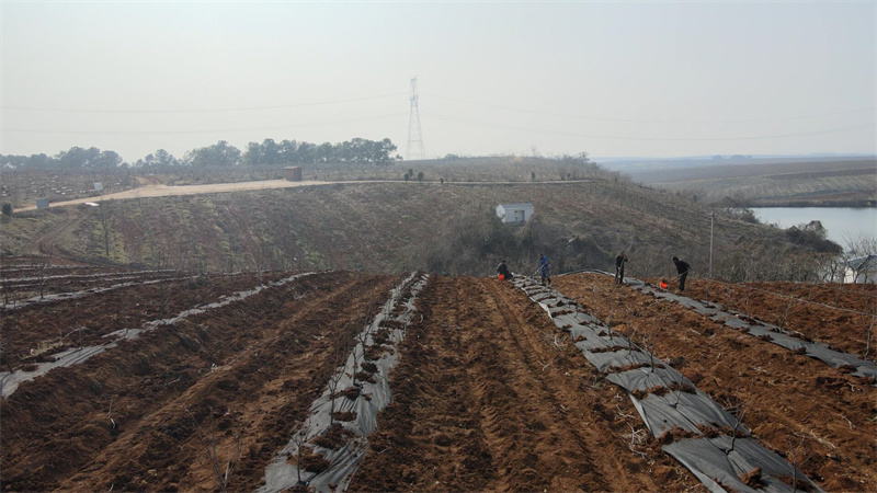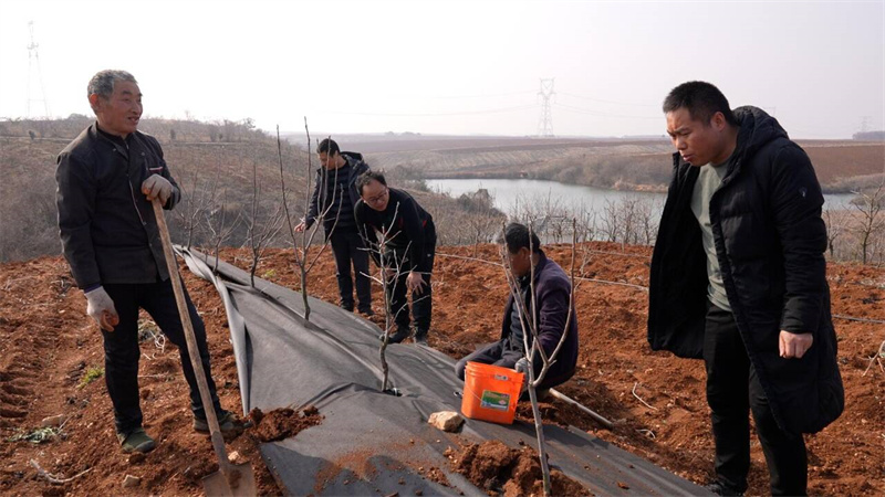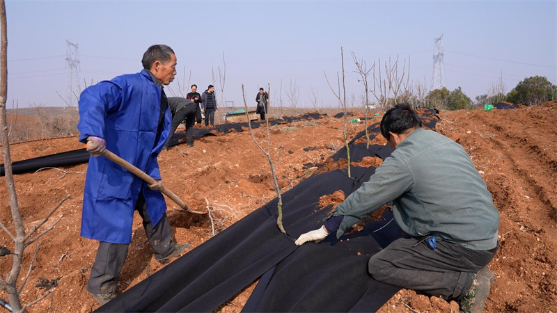 3月2日,在流水鎮(zhèn)一處林果示范基地,多名工人正手拿工具,為果樹根部披上一層黑色的保護(hù)膜。