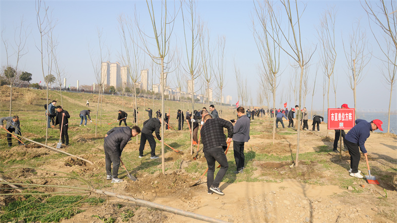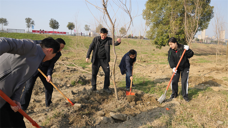 三月的宜城萬象更新,天藍(lán)水綠扮靚美麗漢江。來到植樹點(diǎn),大家紛紛投入到忙碌的勞動(dòng)中。他們熱情高漲、干勁十足,揮鍬鏟土、踩土壓實(shí),現(xiàn)場(chǎng)呈現(xiàn)一派熱火朝天的勞動(dòng)景象。