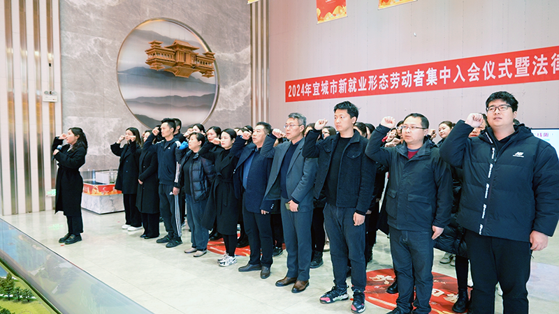 當(dāng)天上午,宜城市九洲龍城營(yíng)銷大廳內(nèi)熱鬧非凡,2024年宜城市新就業(yè)形態(tài)勞動(dòng)者集中入會(huì)儀式暨法律宣講活動(dòng)在這里熱烈舉行。