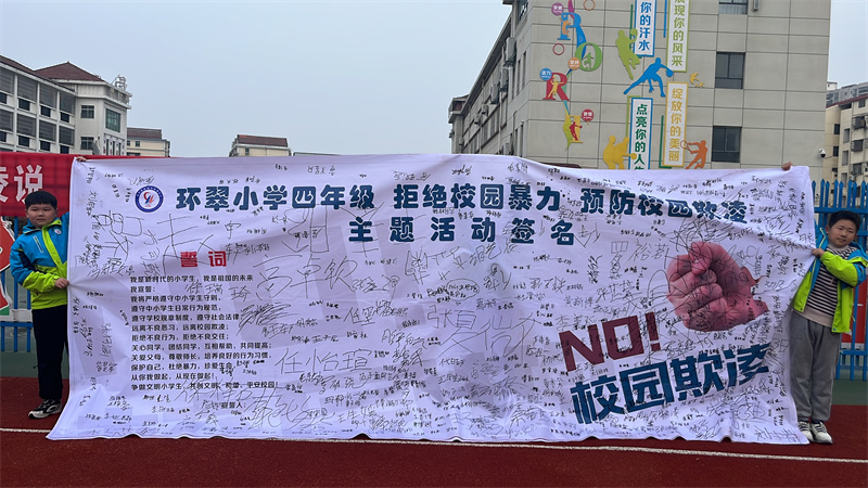 報(bào)道:為了加強(qiáng)校園安全管理,更好地防范小學(xué)生欺凌事件的發(fā)生,促進(jìn)學(xué)生身心健康,保護(hù)未成年人健康成長,3月27日,環(huán)翠小學(xué)開展校園防欺凌宣誓簽名活動(dòng)。