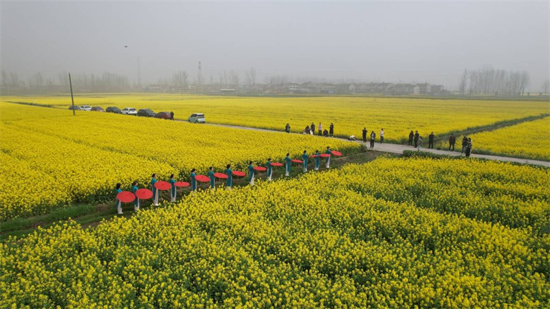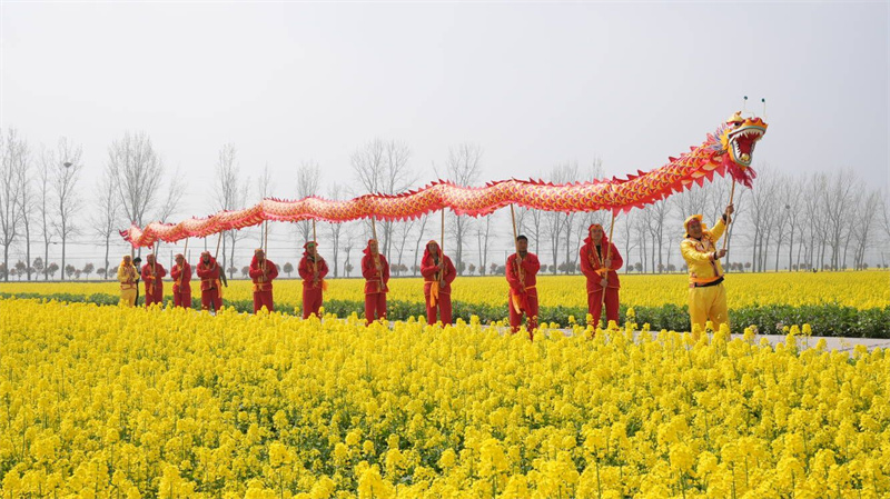 在油菜花的田間地頭,一場別開生面的舞龍表演正在上演。由當(dāng)?shù)剞r(nóng)民組成的舞龍隊,在田間舞動,呈現(xiàn)出“現(xiàn)實版龍鳳呈祥”的喜慶場景,為這片花海增添了幾分熱鬧與喜慶。