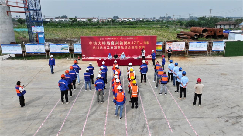 襄荊高鐵漢江特大橋全長(zhǎng)12.961千米,為襄荊鐵路全線(xiàn)主要控制性工程。此次演練模擬襄荊高鐵XJZQ-1標(biāo)漢江特大橋因連日強(qiáng)降雨,外加上游泄洪影響,水位猛漲2米,出現(xiàn)370#橋墩處邊坡受損和搶險(xiǎn)人員不慎落水急需救助險(xiǎn)情。