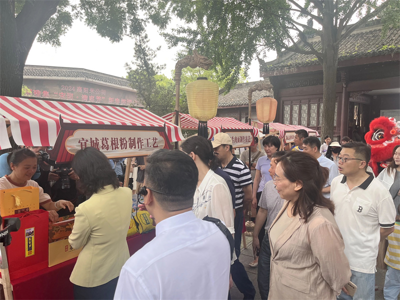 宜城葛根粉制作工藝和宜城市松花皮蛋制作技藝等攤位前,旅客絡(luò)繹不絕,格外受青睞,攤位上的貨物很快銷售一空。