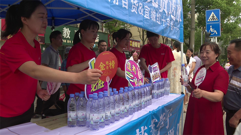 6月7日,在宜城一中、二中、職業(yè)高中考點,一些商家和志愿者在道路兩邊有序設(shè)置服務(wù)臺,為過往的家長和學(xué)生發(fā)放純凈水和扇子等物質(zhì),并送上濃濃的祝福。