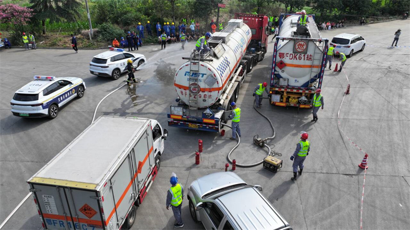 演練模擬公交、旅游大巴車輛發(fā)生追尾事故以及危險(xiǎn)品運(yùn)輸車輛在行駛過程中因泄漏或碰撞受損引起燃燒事故。各運(yùn)輸企業(yè)嚴(yán)格按照應(yīng)急演練方案要求,立即啟動(dòng)應(yīng)急預(yù)案;駕駛員及安全員設(shè)置警示標(biāo)志,救援傷者,迅速撥打110、119、120報(bào)警求助,向公司匯報(bào)請(qǐng)求支援。隨后消防、公安、急救、交通執(zhí)法等部門迅速趕到現(xiàn)場進(jìn)行應(yīng)急救援,圓滿完成了突發(fā)安全事故的應(yīng)急處置。