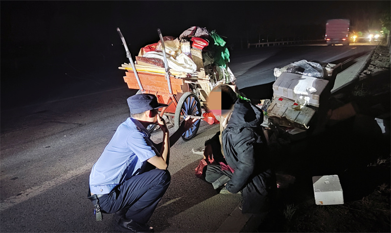 7月2日21時許,宜城市公安局鄭集派出所接到村民報警,發(fā)現一位操著外地口音的拾荒老人坐在國道邊,神情疲憊,疑似走失。