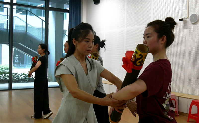 “演奏蘭花筒的技巧也是蠻多的,我們在懷抱蘭花筒的時(shí)候一定要遠(yuǎn)一點(diǎn),在輕擊它的時(shí)候,我們是食指、中指、無名指,然后輕擊蘭花筒的底部。我試試聽聽它的聲音,它的聲音會(huì)清脆嘹亮,但是必須要用你的手腕去帶動(dòng)它。它的唱腔部分要字正腔圓,咱們就用一句最簡短的唱詞來說明它。比方說‘蘭花筒誒’,它要字正腔圓,讓每一個(gè)字都能夠傳到觀眾的耳朵當(dāng)中去!崩罴t英介紹道。