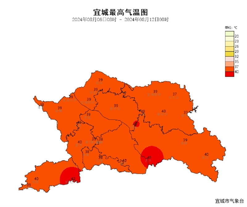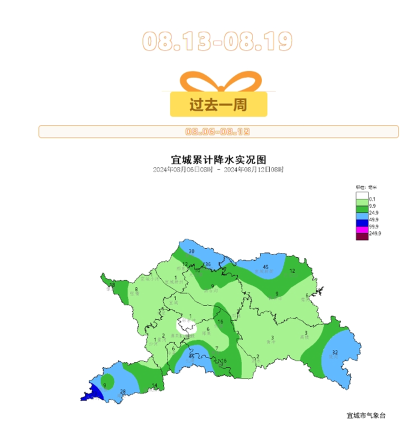 過去一周宜城以晴熱天氣為主,局部伴有降水過程。宜城站過程累計降水量達(dá)0.5mm,,日最高氣溫38.8℃,最低氣溫25.1℃。