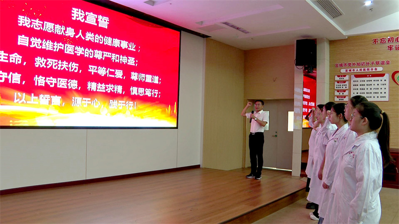 宜城市人民醫(yī)院對(duì)今年入職的7名青年醫(yī)師代表授予“白大褂”。并站在《中國(guó)醫(yī)師宣誓誓詞》下進(jìn)行莊嚴(yán)宣誓。同時(shí)還對(duì)該院前期舉辦的急危重癥搶救技能和青年醫(yī)師知識(shí)競(jìng)賽的先進(jìn)集體和個(gè)人進(jìn)行表彰。部分醫(yī)師代表作經(jīng)驗(yàn)交流。