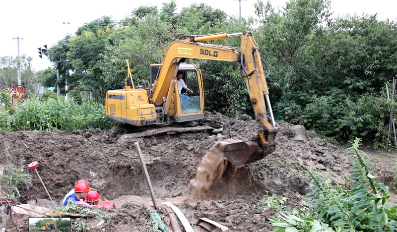 主管道漏水量太大,帶水作業(yè)積水較深,管道周圍的各種情況不明,給開挖以及搶修帶來很多困難,搶修人員一邊開挖一邊觀察。主管道開挖出來后,沒有絲毫猶豫立即跳下泥水中,摸索著用抱箍對主管道的爆管點進行封堵。