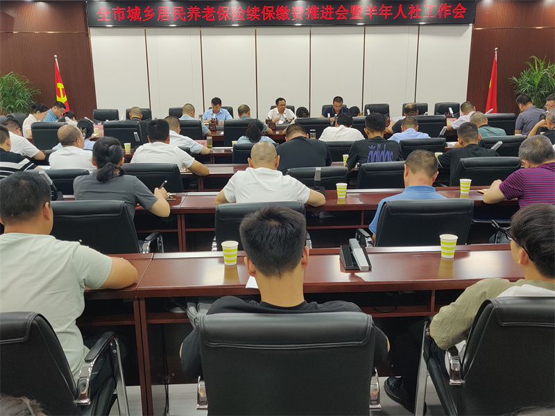 全市城鄉(xiāng)居民養(yǎng)老保險(xiǎn)續(xù)保繳費(fèi)推進(jìn)會(huì)暨半年人社工作會(huì)現(xiàn)場(chǎng)