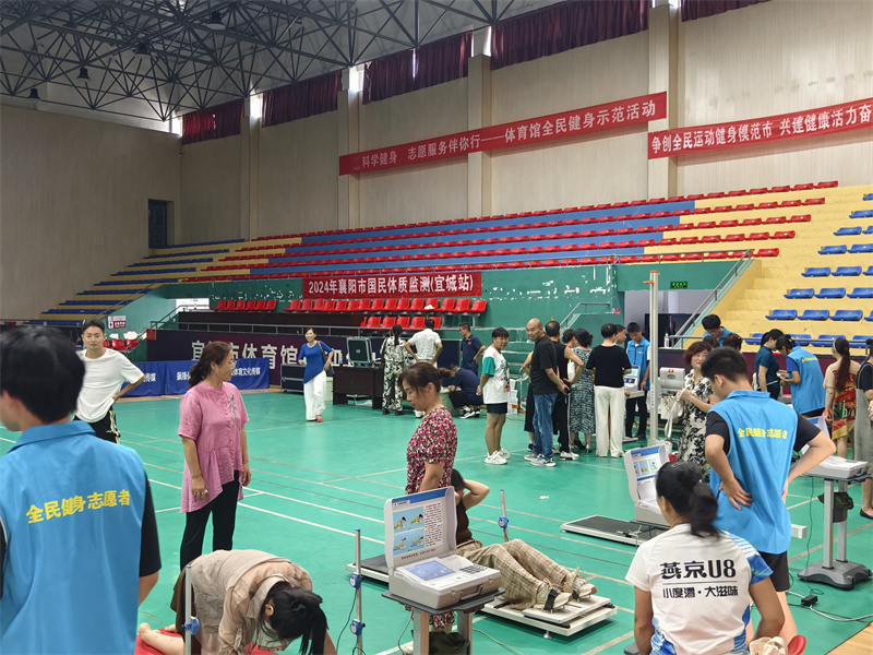 在宜城市體育館,工作人員搭建起體測設(shè)備,耐心細(xì)致地為受測對象進(jìn)行監(jiān)測。此次測試內(nèi)容涵蓋身體形態(tài)、機(jī)能、素質(zhì)三方面, 通過系統(tǒng)對每人各項監(jiān)測數(shù)據(jù)進(jìn)行綜合評估分析,現(xiàn)場出具體質(zhì)評估報告。工作人員還在現(xiàn)場為每名受測對象詳細(xì)講解、分析評估報告,提供健身咨詢和服務(wù)。