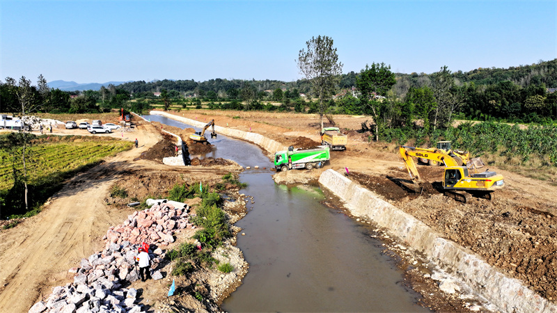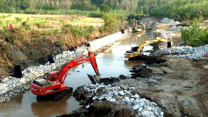 記者在碑河治理工程胡坪、楊灣、石河等地段施工現(xiàn)場看到,施工人員正忙著砌擋土墻,各類工程設(shè)備高效運轉(zhuǎn),共同奏響了建設(shè)的交響曲。