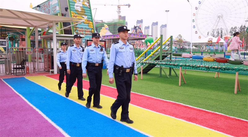 在宜城市青創(chuàng)園,宜城市公安局龍頭派出所的民警們正在對游樂園進行安全檢查,確保市民的人身安全。