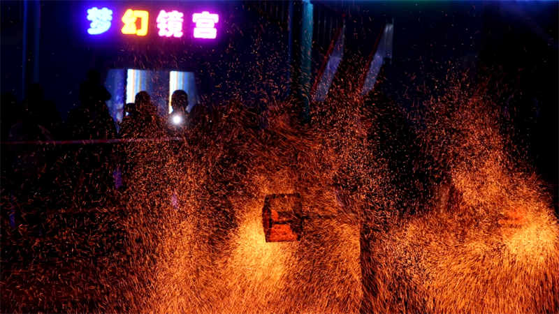 火壺表演是國家級非物質(zhì)文化遺產(chǎn)之一,燒好的超過800度高溫木炭被放入兩邊的鐵網(wǎng),隨著表演者上下抖動鐵網(wǎng),火星四濺升騰,形成“火樹銀花”的震撼場面,寓意驅(qū)疾避禍和百家安寧。來自河南開封的火壺表演者王治國,用這場沐浴在火海里的表演,展現(xiàn)出非遺技藝的特有魅力。