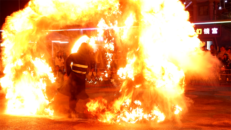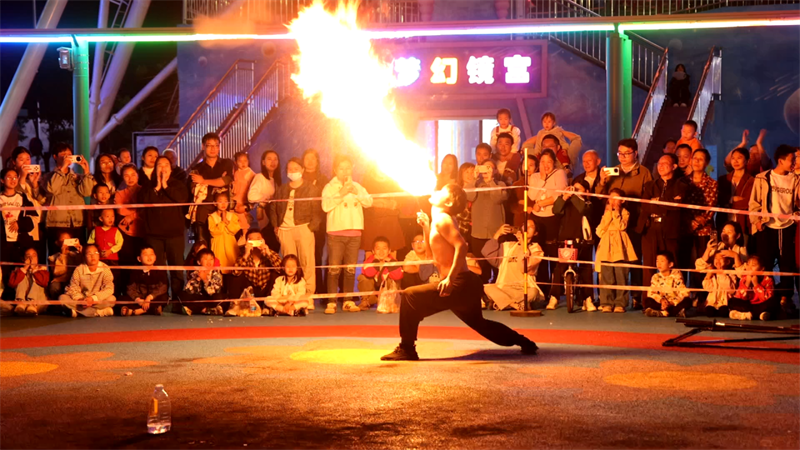 活動現(xiàn)場,人頭攢動,氣氛熱烈。晚上7點30分,演出活動正式開始,特技表演火燒身、噴火表演、舞火片,舞火刀、舞火棍、火壺表演輪番上陣,為觀眾獻上一場精彩的視覺盛宴。