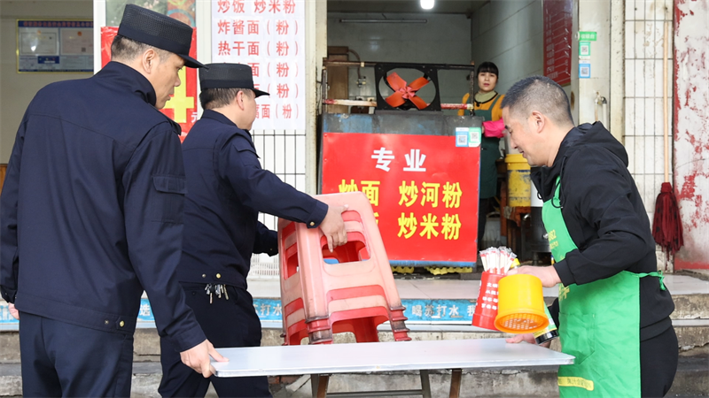 城管執(zhí)法人員幫助商戶搬運餐桌