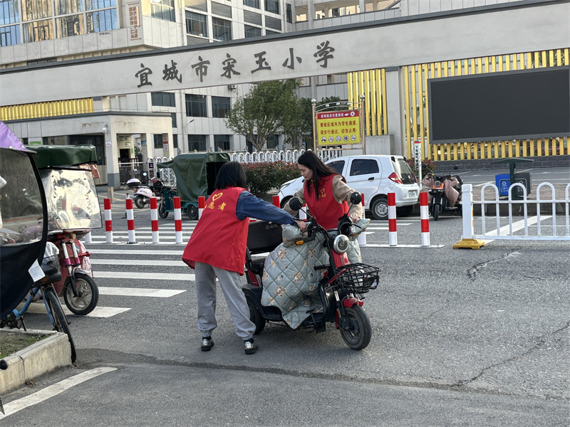 家長(zhǎng)志愿者在幼兒園門(mén)口執(zhí)勤