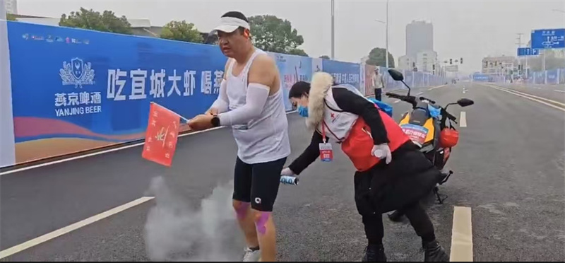 賽事現(xiàn)場(chǎng),宜城市紅十字移動(dòng)AED志愿服務(wù)隊(duì)隊(duì)員為腿部抽筋、肌肉拉傷運(yùn)動(dòng)員噴射降溫噴霧,幫助他們順利完成比賽。