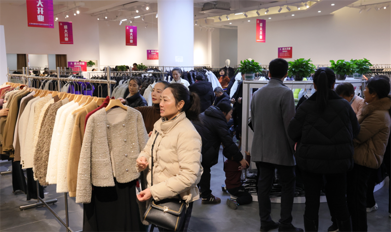 開業(yè)慶典現(xiàn)場(chǎng),彩旗飄揚(yáng),人頭攢動(dòng),熱鬧非凡,處處洋溢著開業(yè)的喜慶氣息。天舒服飾工廠直營(yíng)店內(nèi),羽絨服、休閑裝等各類服飾琳瑯滿目,很多顧客正在挑選心儀的服飾。