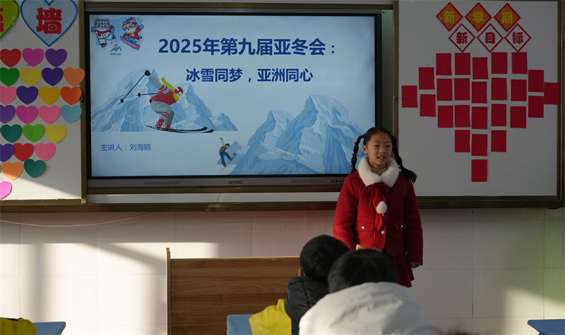 走進(jìn)熟悉的校園,孩子們發(fā)現(xiàn)干凈整潔的教室布置一新:黑板上是歡迎辭和祝福語,書本整齊地擺放在桌面上,走廊里、墻面上呈現(xiàn)的是“冰雪文化”、“亞冬會知識宣傳”和非遺文化的介紹以及作品展示等。老師們的“別有用心”瞬間點燃了孩子們新學(xué)期的學(xué)習(xí)熱情。