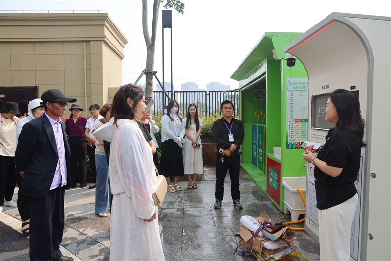 在東泰湖畔一號(hào)小區(qū),市環(huán)衛(wèi)局工作人員向 “無(wú)廢社區(qū)” 工作人員及現(xiàn)場(chǎng)居民詳細(xì)介紹小區(qū)配備的再生資源智能回收箱。該回收箱集智能化、便捷化于一體,居民只需通過(guò)簡(jiǎn)單操作,就能將可回收物分類投放,系統(tǒng)會(huì)自動(dòng)稱重并給予相應(yīng)現(xiàn)金獎(jiǎng)勵(lì),極大地激發(fā)居民參與垃圾分類的積極性。隨后,工作人員還現(xiàn)場(chǎng)演示各類垃圾正確分類投放到對(duì)應(yīng)垃圾桶的方法,從可回收物、有害垃圾到廚余垃圾、其他垃圾,一一進(jìn)行細(xì)致講解,讓大家對(duì)垃圾分類有更清晰、準(zhǔn)確的認(rèn)識(shí)。