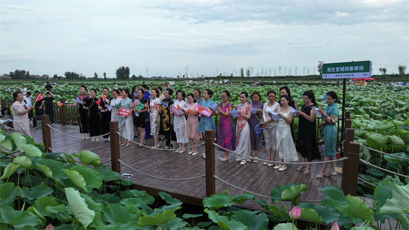 盛夏荷花斗艷開,荷畔旗袍別樣美。旗袍秀環(huán)節(jié),30多名巾幗志愿者身著古裝旗袍,伴隨著古典音樂,身姿優(yōu)雅的在荷塘步道上漫步輕舞,與荷花美景交相映襯,走成一道靚麗的風(fēng)景線,也向大家傳遞女性的優(yōu)雅與自信。