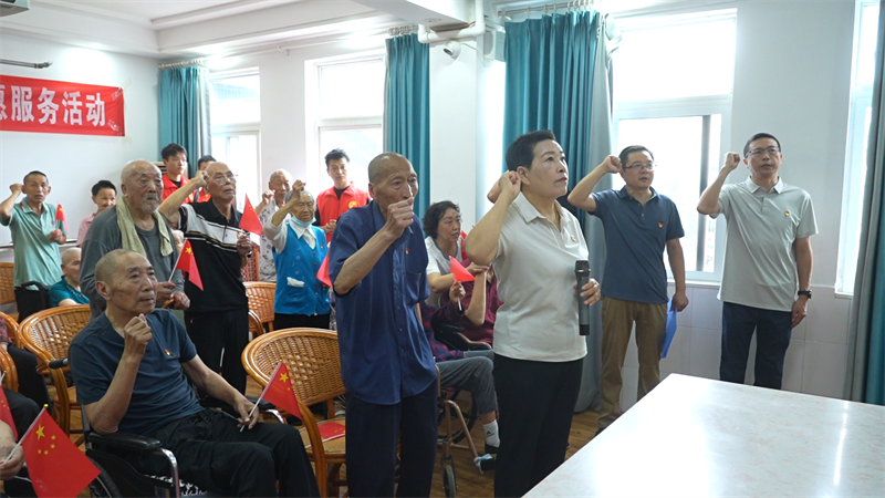 “我志愿加入中國共產(chǎn)黨,擁護(hù)黨的綱領(lǐng),遵守黨的章程……”在福利院黨員活動(dòng)室,老黨員們跟著志愿者一起高舉右臂,莊嚴(yán)宣誓。