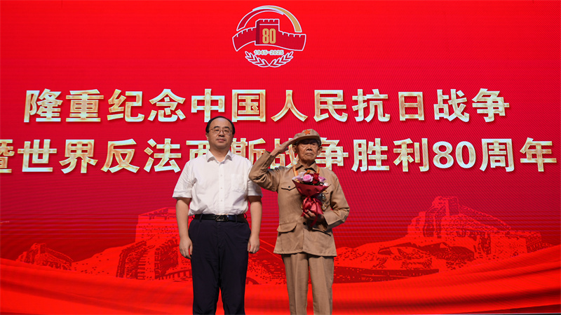 活動(dòng)現(xiàn)場,武義泉為抗戰(zhàn)老兵丁邦安頒發(fā)中國人民抗日戰(zhàn)爭勝利八十周年紀(jì)念章,感謝抗戰(zhàn)老兵們?yōu)榭箲?zhàn)勝利作出的貢獻(xiàn)。